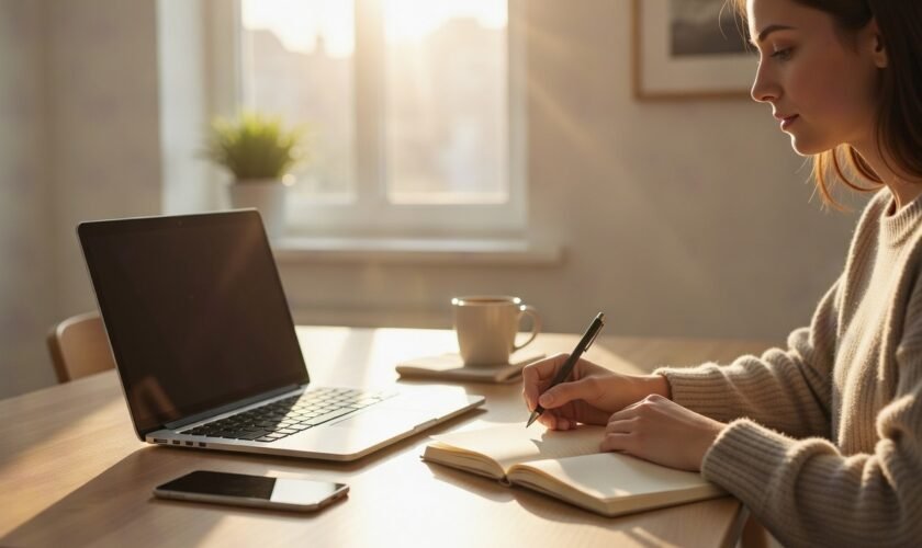 [IMAGE: Person working at minimalist desk, writing in notebook with laptop closed, calm natural light]