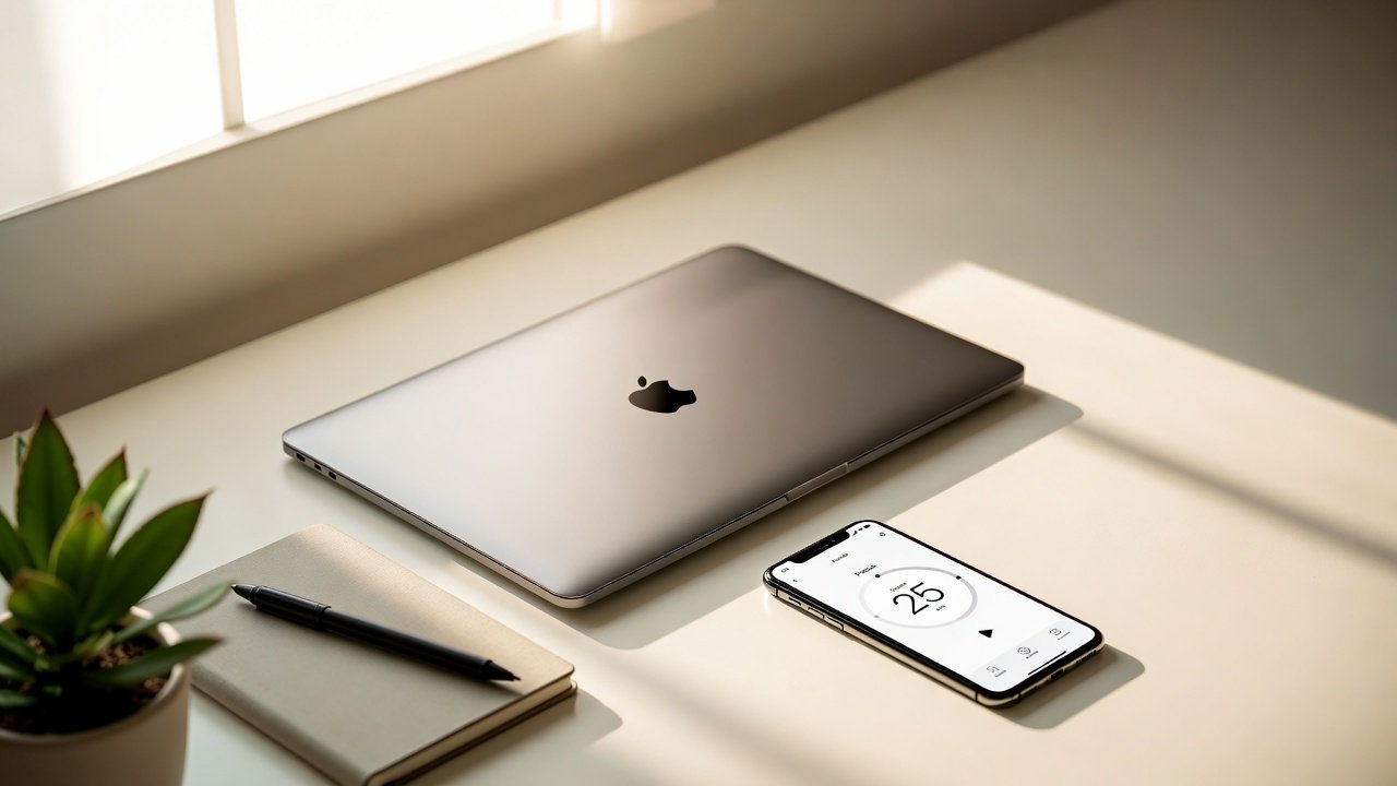 This image captures the essence of a modern tech environment that’s thoughtfully arranged to support productivity, reflection, and mindful engagement — a workspace that invites focus instead of fragmentation.